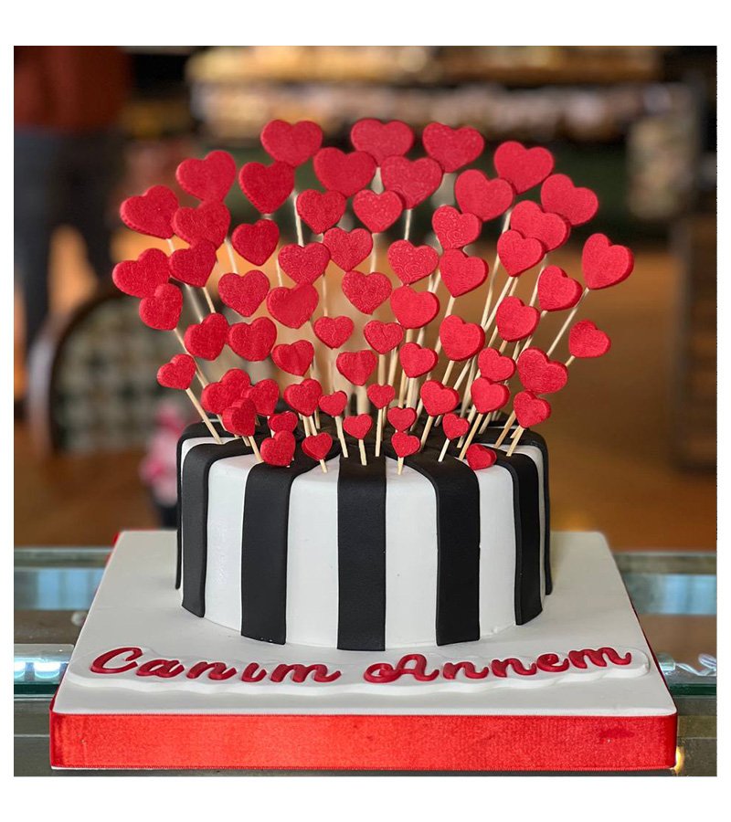 Bu pasta, şık siyah ve beyaz şeritli tasarımı ve kalp şekilli süslemeleri ile çok özel ve göz alıcı bir görünüme sahip. Pasta üzerinde “Canım Annem” yazısı ile annelere özel bir kutlama sunuyor. Bu pastaya uygun bir isim belirlerken, anneler günü veya anneler için özel günler temasını vurgulayan bir isim seçeceğim.