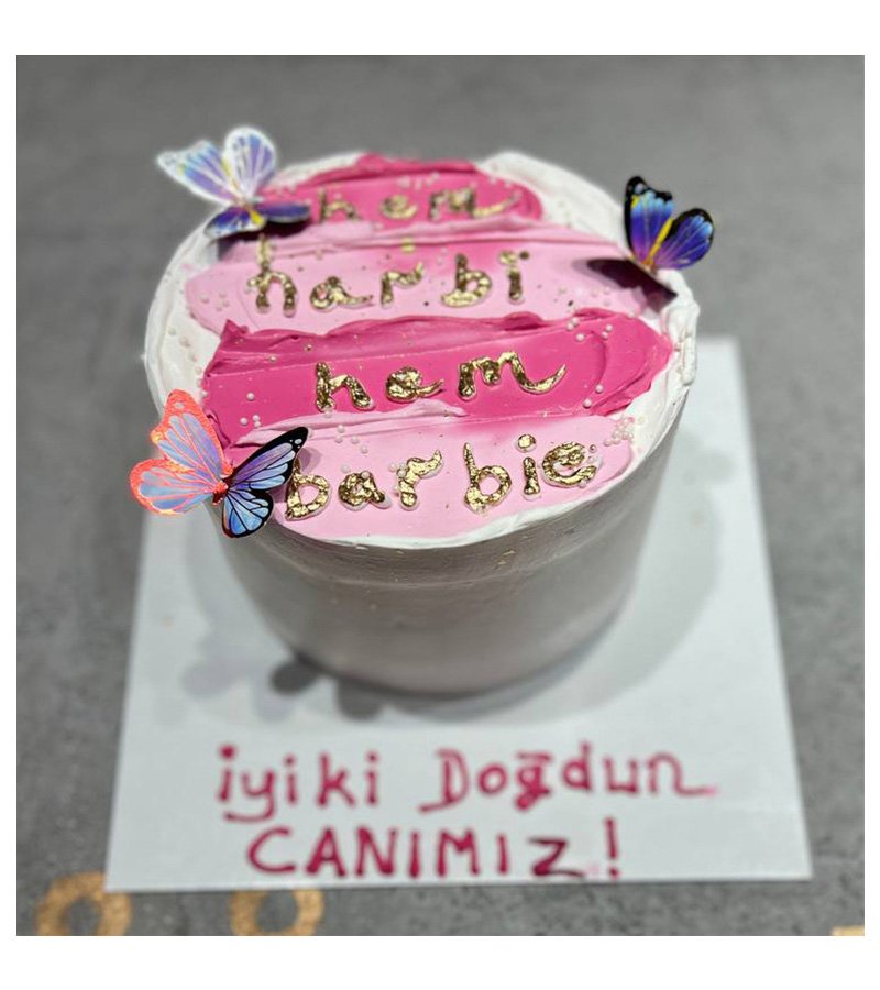 Kelebeklerle Barbie Pastası, pembe detaylar ve kelebek süslemeleri ile dolu, eğlenceli ve şık bir pastadır. “Hem Harbi Hem Barbie” yazısı ile bu pasta, doğum günü kutlamaları için idealdir. Kişiye özel isim ve mesaj ekleyerek pastayı daha da özel hale getirebilir, unutulmaz bir kutlama yapabilirsiniz.